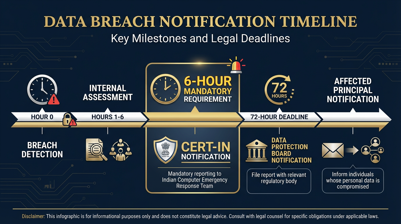 Separately, the CERT In Directions under the IT Act require reporting cyber security incidents within just 6 hours. These two obligations work together, not as alternatives. Organisations need parallel notification systems for both.