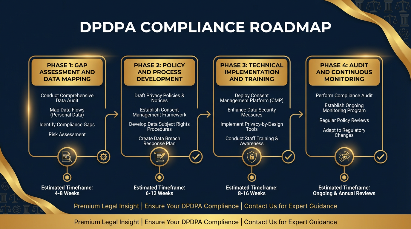Phase one encompasses data mapping to identify all personal data processed. This includes categorisation by sensitivity and source, documentation of processing purposes and legal bases, and mapping of data flows including cross border transfers.