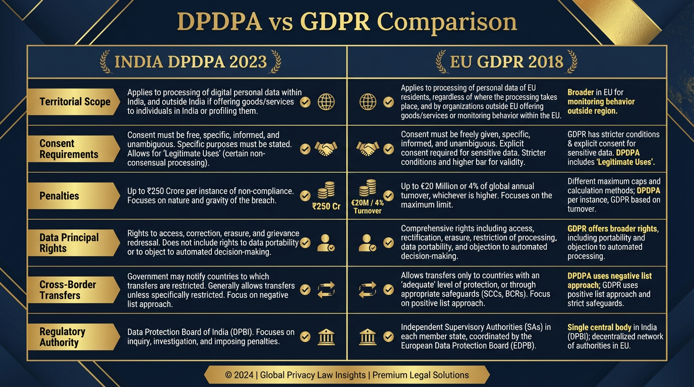 Legitimate interests, a cornerstone GDPR processing basis, has no direct equivalent in DPDPA's "legitimate uses" framework. The Indian framework is narrower and more prescribed. Extraterritorial reach creates overlapping compliance obligations for multinationals, though DPDPA ties its territorial scope explicitly to offering goods or services rather than GDPR's broader monitoring criterion.